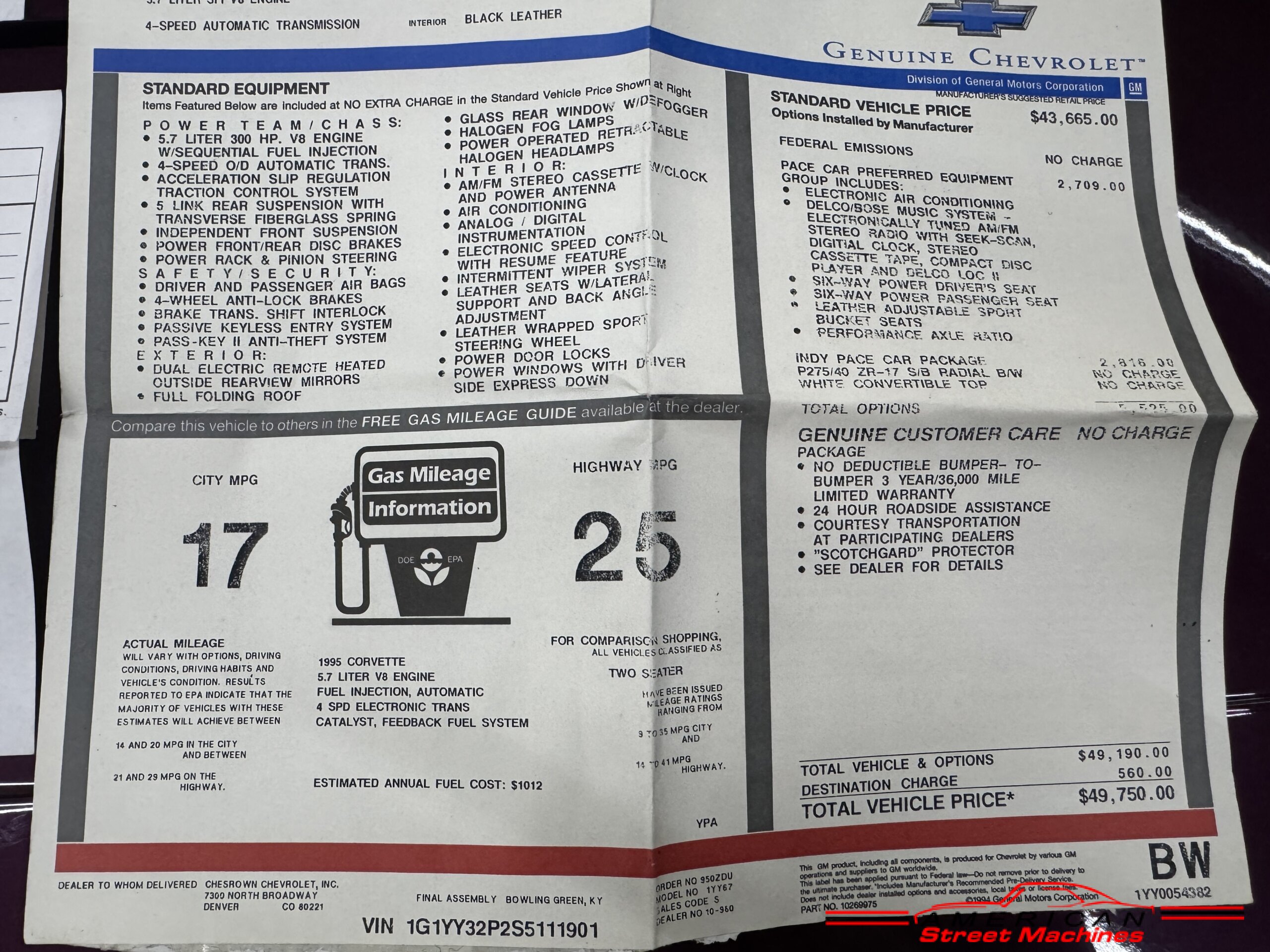 American Street Machines Inc is proud to offer this collectible Corvette Pace Car for sale out of a private collection. This collectable Corvette was purchased new and parked in a time capsule. Has 2564 original miles and still pertains all original sales documents along with the window sticker. Hard to find a 95 Corvette Pace Car with this low of miles that was this well preserved.